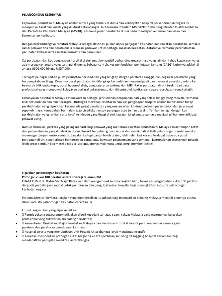 Ismail Sabri berkata kebenaran itu diberikan sama ada mereka menggunakan. Seseorang pesakit boleh memilih untuk mendapatkan rawatan di mana-mana hospital yang dikenali di peringkat antarabangsa dan tinggal di Malaysia sehingga sembuh atau mereka boleh melancong ke. Persoalan yang berputar-putar dalam kotak minda kita ialah apakah langkah-langkah untuk memajukan industri pelancongan kesihatan di Malaysia.