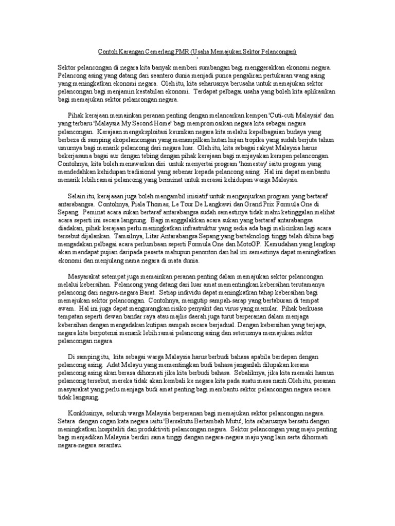Kaum-kaum di negara kita yang mempunyai adat budaya dan cara pemakanan yang berbeza dan istimewa mampu menarik minat pelancong asing. Contoh Karangan PT3 Kebaikan Sektor Pelancongan Hal-hal yang berkaitan dengan sektor pelancongan kerap menjadi bahan paparan di media massa. Contoh Karangan Kepentingan sektor industri pelancongan kepada rakyat dan negara Pendahuluan.